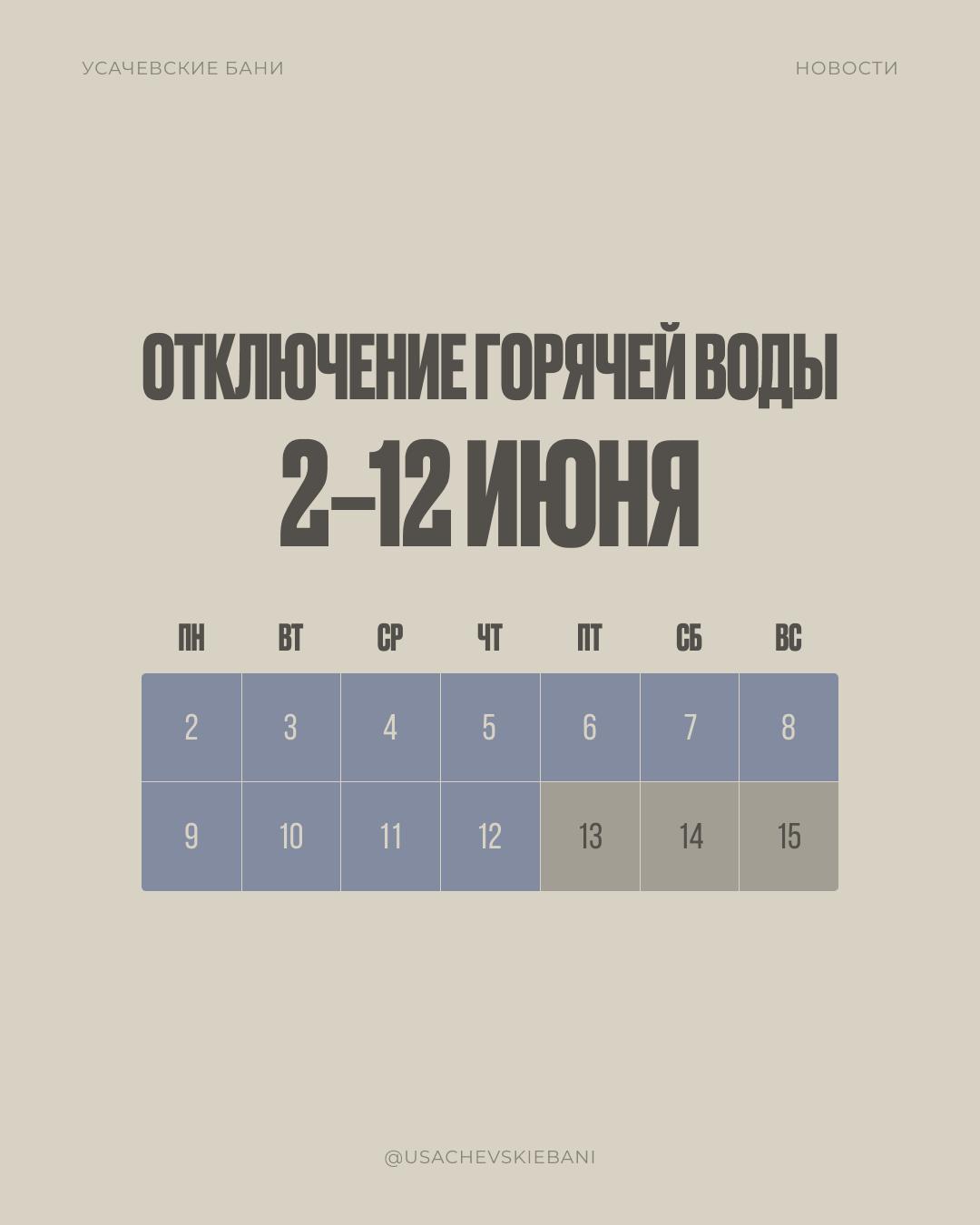 С 2 по 12 июня в нашем районе будут проходить плановые работы на теплосетях, поэтому в Усачевских банях временно не будет горячей воды.