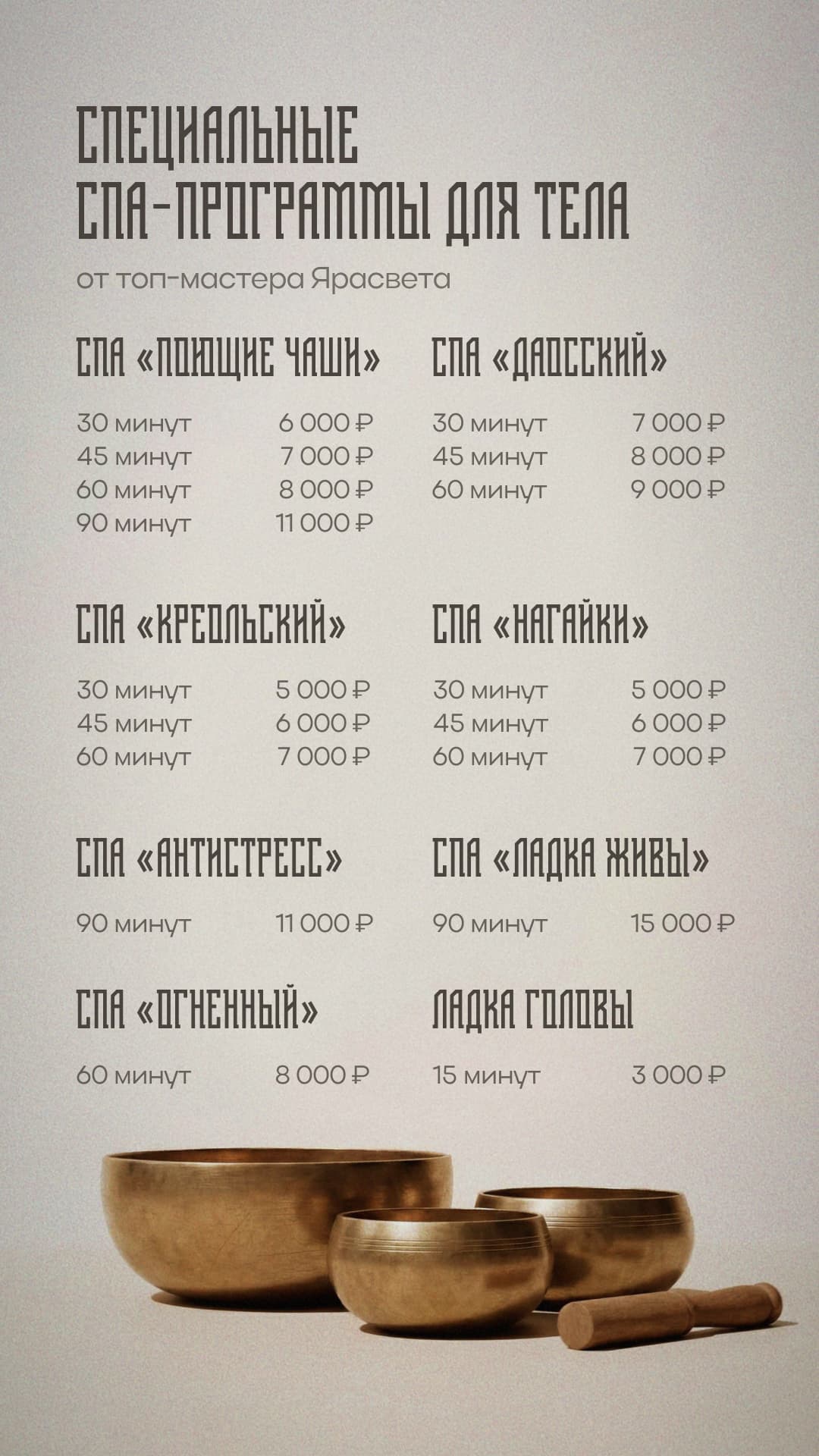 Каждая программа имеет свой характер и глубину воздействия — от мягкого расслабления до активной тонизирующей работы. Формат подбирается индивидуально в зависимости от запроса и самочувствия гостя.